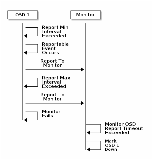 If an Ceph OSD Daemon doesn’t report to a Ceph Monitor, the Ceph Monitor will consider the Ceph OSD Daemon down after the mon osd report timeout elapses. A Ceph OSD Daemon sends a report to a Ceph Monitor when a reportable event such as a failure, a change in placement group stats, a change in up_thru or when it boots within 5 seconds. You can change the Ceph OSD Daemon minimum report interval by adding an osd mon report interval setting under the [osd] section of your Ceph configuration file, or by setting the value at runtime. A Ceph OSD Daemon sends a report to a Ceph Monitor every 120 seconds irrespective of whether any notable changes occur. You can change the Ceph Monitor report interval by adding an osd mon report interval max setting under the [osd] section of your Ceph configuration file, or by setting the value at runtime.